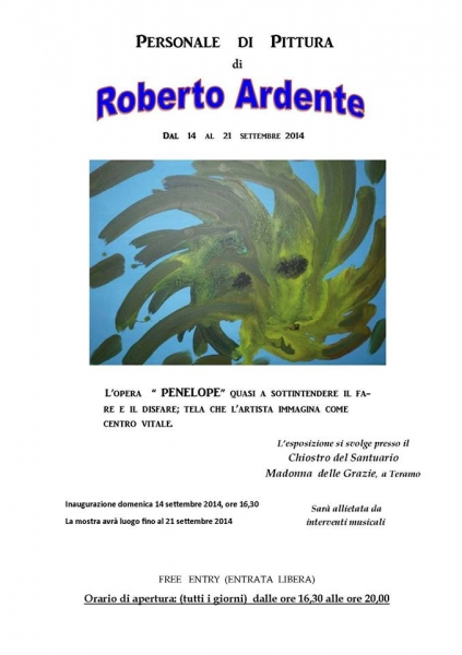 Si terrà domenica 14 settembre, alle ore 16,30, l'inaugurazione della mostra di pittura di Roberto Ardente. L’esposizione si svolgerà presso il Chiostro del santuario Madonna delle Grazie a Teramo e sarà allietata da interventi musicali di artisti teramani. La mostra resterà aperta fino al 21 settembre dalle ore 16.30 alle ore 20.00. La cittadinanza è invitata a partecipare. L'ingresso è libero.