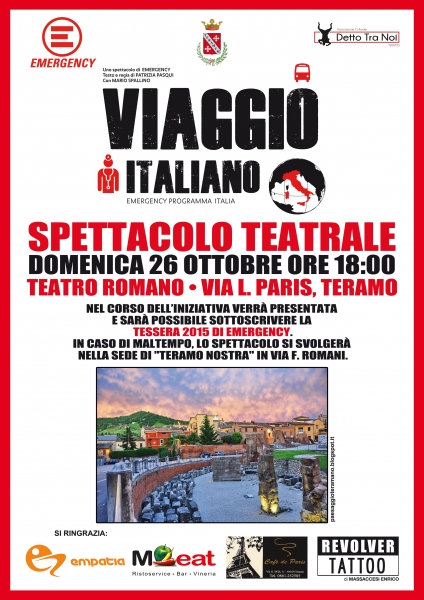 Domenica 26 ottobre alle ore 18, nello splendido scenario del Teatro Romano di Teramo in via Paris, andrà in scena lo spettacolo teatrale di Emergency "Viaggio Italiano" con l'attore Mario Spallino.
