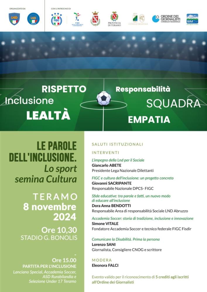 È in questa direzione che va l’incontro “Le parole dell’inclusione. Lo Sport semina Cultura” che si terrà venerdì 8 novembre alle ore 10.30 allo Stadio Bonolis di Teramo.