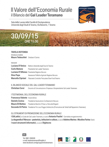 L'occasione sarà la Tavola rotonda "Il Valore dell'economia rurale", in programma il 30 settembre, alle ore 15, presso la Sala Lauree di Giurisprudenza dell'Università di Teramo.