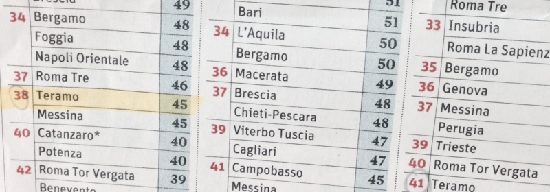 Una risalita sprint dal 55esimo posto al 38esimo nel giro di un solo anno. È cosi che l'Università degli studi di Teramo guadagna posizioni nella classifica pubblicata annualmente su Il Sole 24 Ore e che prende in considerazione gli atenei italiani, statali e non. La ricerca è stata pubblicata stamane e rende chiaramente soddisfatto il Rettore Luciano D'Amico: "È motivo di grande orgoglio per noi recuperare così tante posizioni nel giro di un solo anno - ha commentato il Magnifico dell'UniTe - . Il nostro obiettivo è quello di ripeterci per l'anno a venire, riuscendo magari ad entrare nelle prime 30 Università d'Italia".