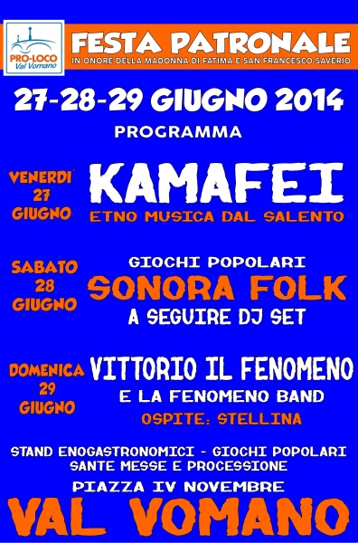 In onore della Madonna di Fatima e San Francesco Saverio, in piazza IV Novembre a Val Vomano, sono previste tre notti di musica. La manifestazione, organizzata dalla locale Pro Loco con tre serate in compagnia dei Kamafei, Sonora Folk, Vittorio il Fenomeno e Stellina, aprirà i battenti questa sera, con l'esibizione del gruppo salentino Kamafei - Etno musica del Salento. Domani sera, sabato 28, saliranno sul palco i Sonora Folk dalle 21 alle 23 e a seguire ci sarà il dj set. La serata conclusiva, domenica 29, sarà allietata dalle note della Fenomeno Band con Vittorio il Fenomeno e Stellina.