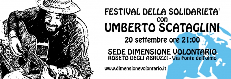Anche quest’anno, l’Associazione ONLUS organizza a Roseto degli Abruzzi, il Festival della Solidarietà . Nella sede dell’associazione (via Fonte dell’Olmo) è prevista per sabato 20 settembre (ore 21), l’esibizione di Umberto Scataglini. Un cantautore che ha, infatti, deciso di aderire all’iniziativa, nata per promuovere e sostenere l’attività di questa realtà teramana. Un'occasione utile anche per vedere dal vivo un musicista folgorato, durante l’adolescenza, da artisti del calibro di Francesco De Gregori, Francesco Guccini, Fabrizio De Andrè, Lucio Dalla, Piero Ciampi, Luigi Tenco e Rino Gaetano.